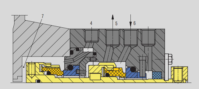 Verwendet Durchflusskontrollöffnungen, um den Fluss der Spülflüssigkeit zur Gleitringdichtung zu begrenzen.