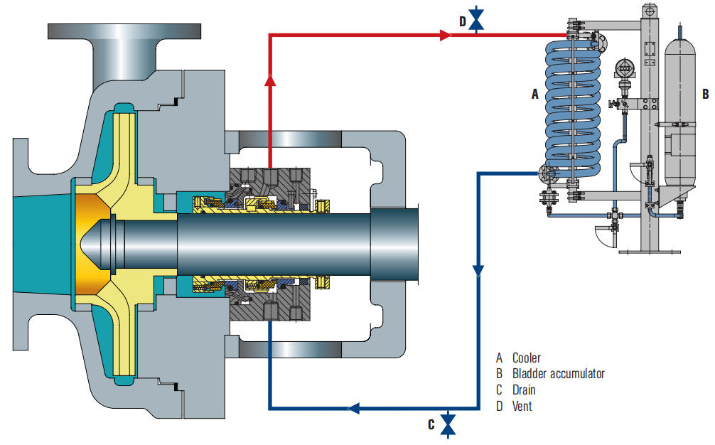 Plan 1 erfordert keine externen Rohrleitungen. Er dient als interne Spülleitung für Gleitringdichtungen. Im Gegensatz zu Plan 11 ist die Spülleitung nicht der Atmosphäre ausgesetzt und verhindert so, dass hochviskose Flüssigkeiten bei niedrigen Temperaturen gefrieren/polymerisieren.
